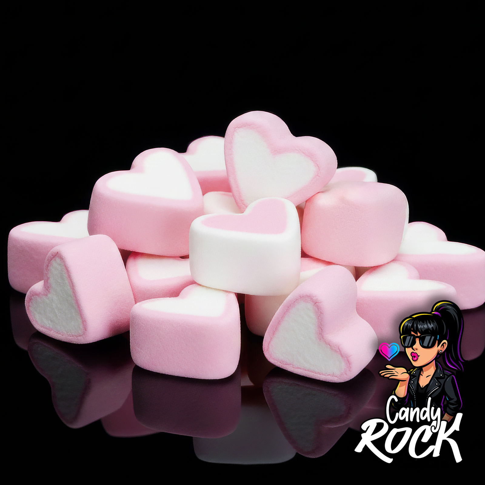 Guimauves en forme de cœur rose et blanc, présentation générale du vrac moelleux sur fond noir, CandyRock.