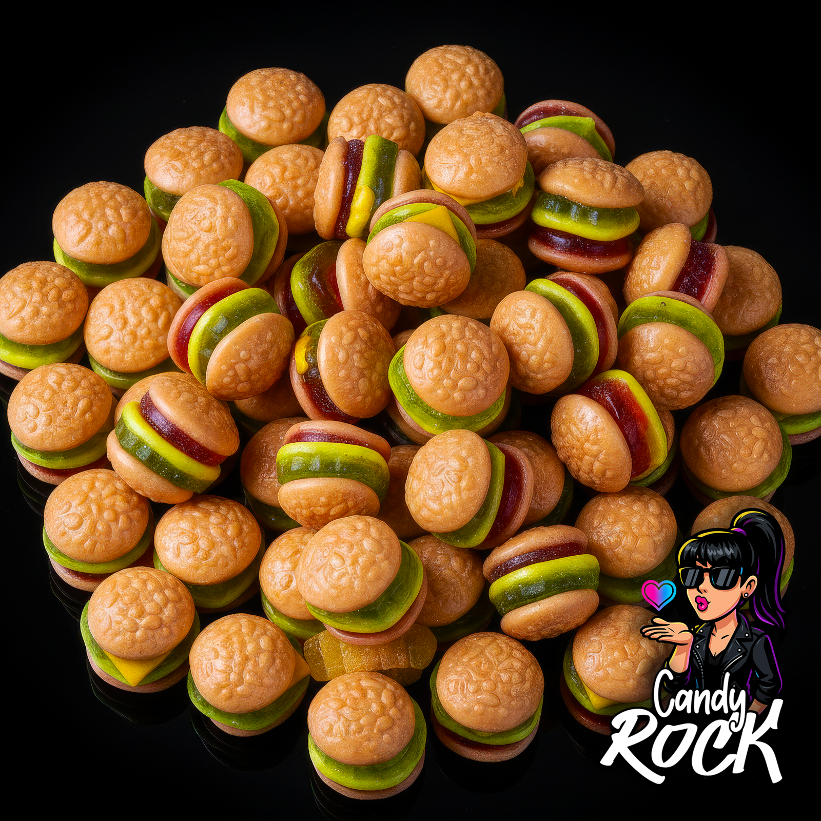 Sous leur petit pain lisse orné de “graines de sésame” texturées, se cachent des couches translucides aux couleurs explosives : vert acide, rouge framboise, jaune neon… Un combo visuel qui claque sur fond noir CandyRock.