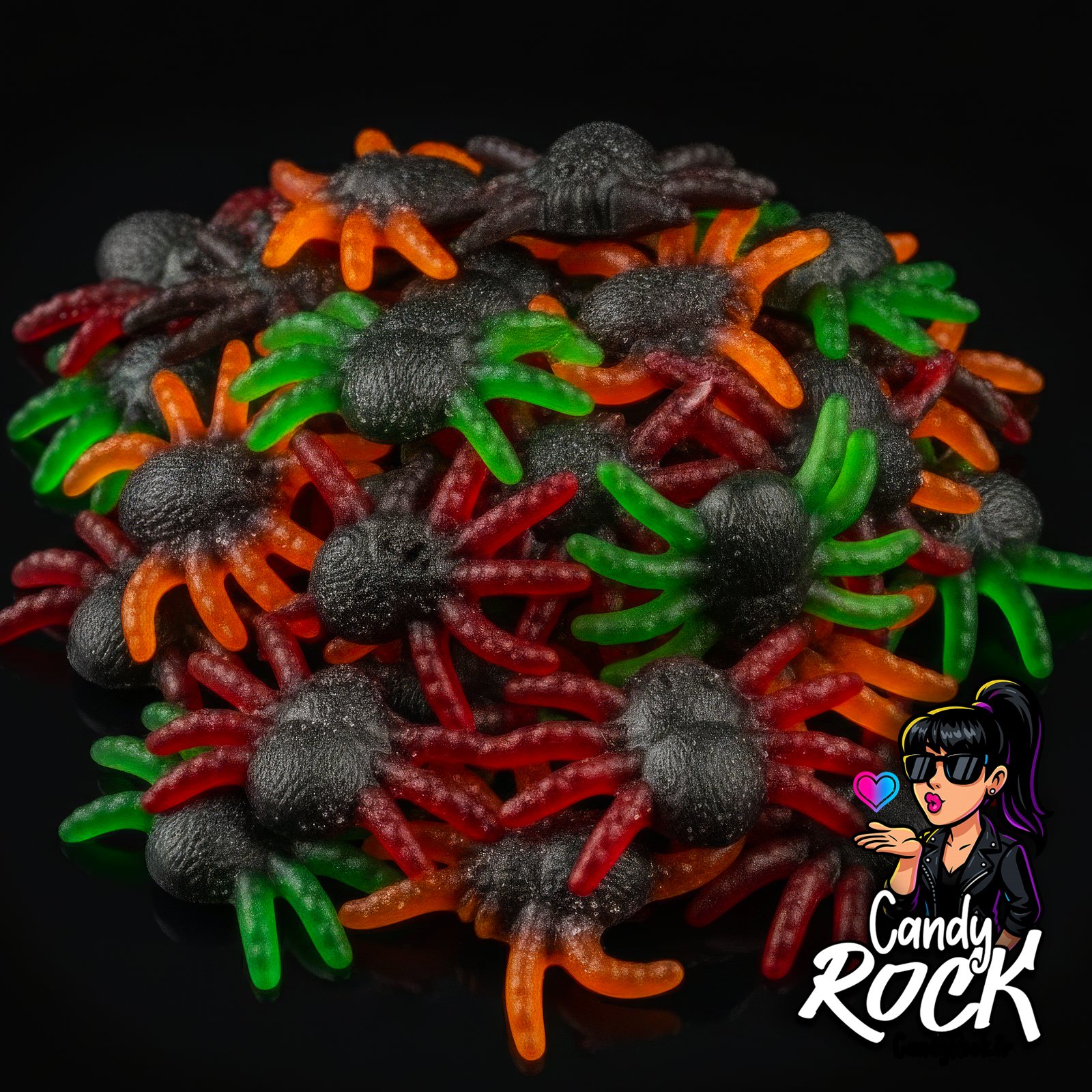 • Tarantules gélifiées lisses multicolores avec corps noir texturé sur fond noir dans l’univers CandyRock.