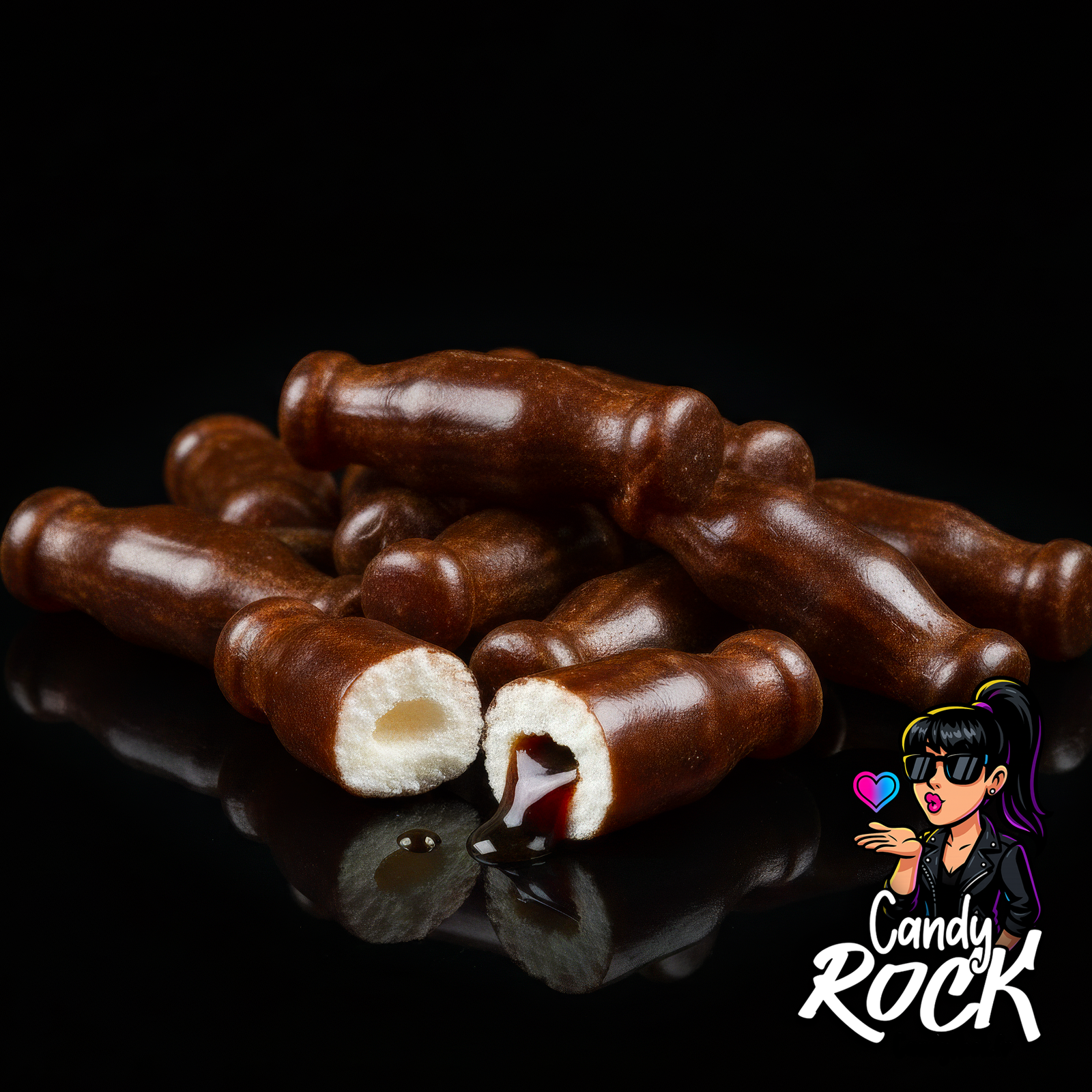 Ces chewing-gums Fini en forme de mini bouteilles ont une vraie attitude : brun glossy façon soda glacé, silhouette rétro irrésistible et cœur liquide cola qui déborde comme un solo de guitare trop chaud.