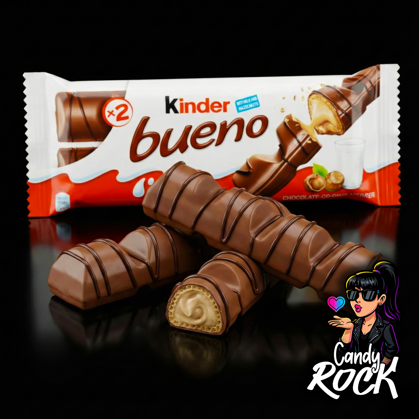• Barre Kinder Bueno entière sur fond noir, chocolat au lait lisse avec deux doigts élégants, CandyRock.