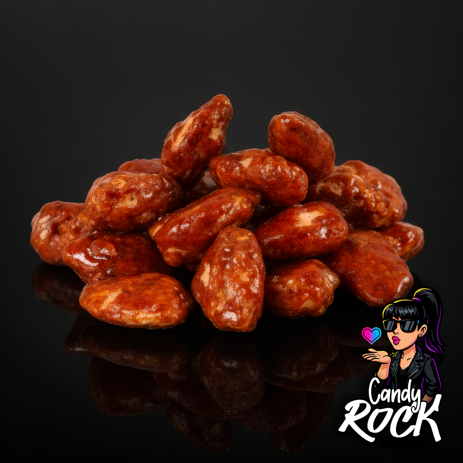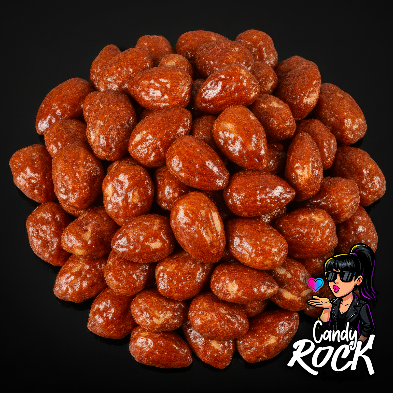 • Amandes pralinées caramélisées entières, surface brillante couleur ambre, présentées sur fond noir CandyRock.