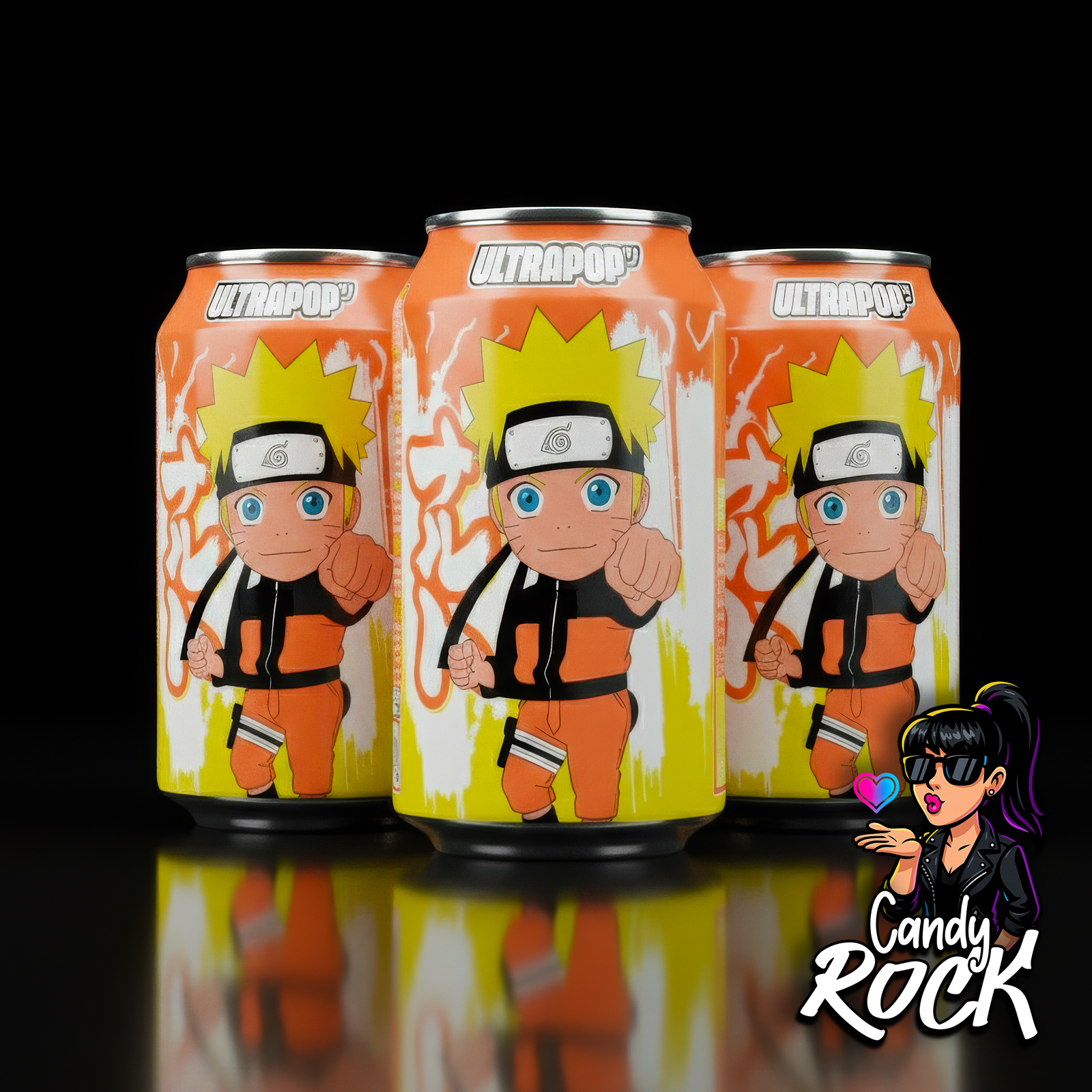 • Canette Ultrapop Naruto saveur orange sur fond noir, design manga japonais énergique, CandyRock.